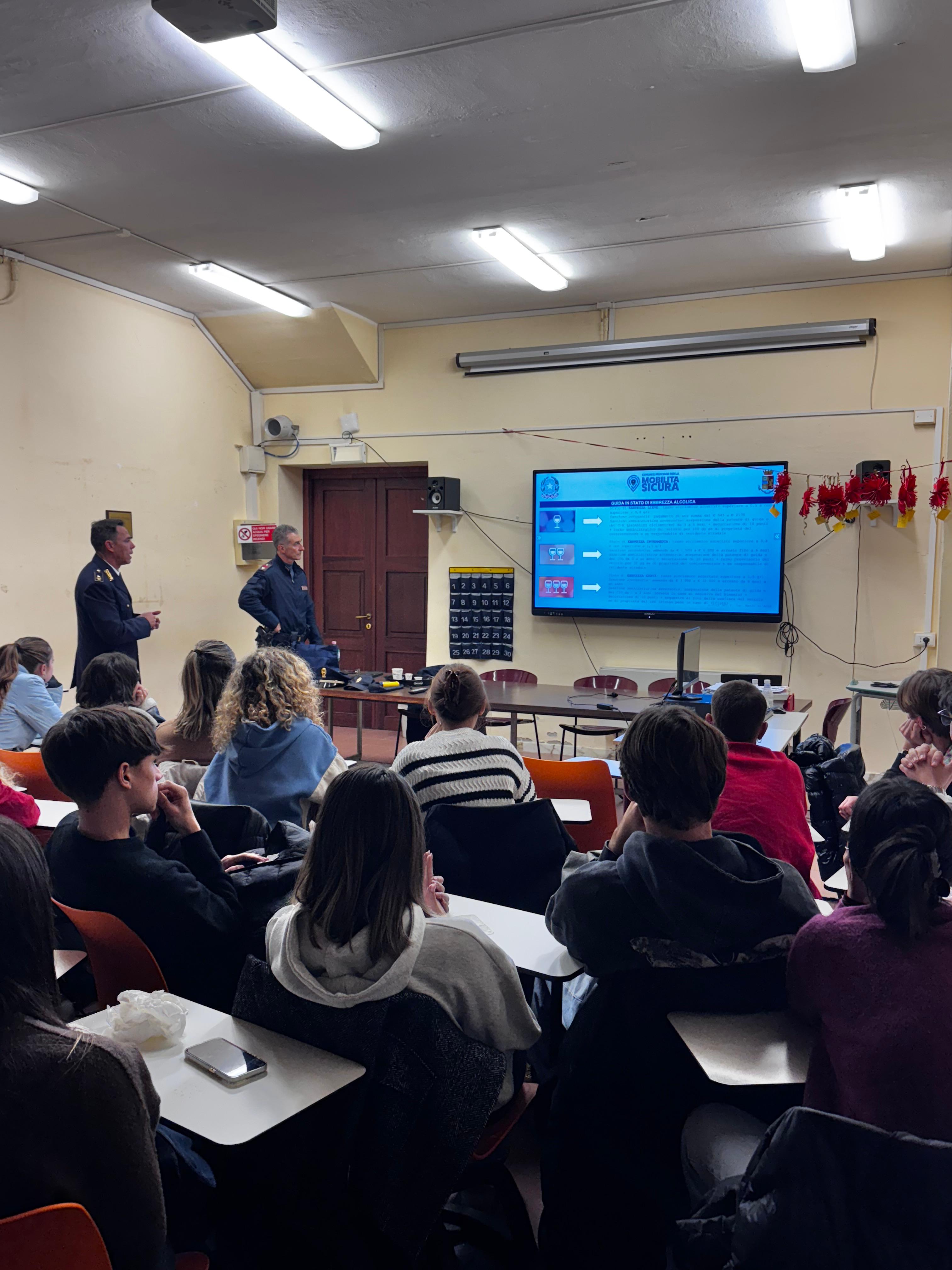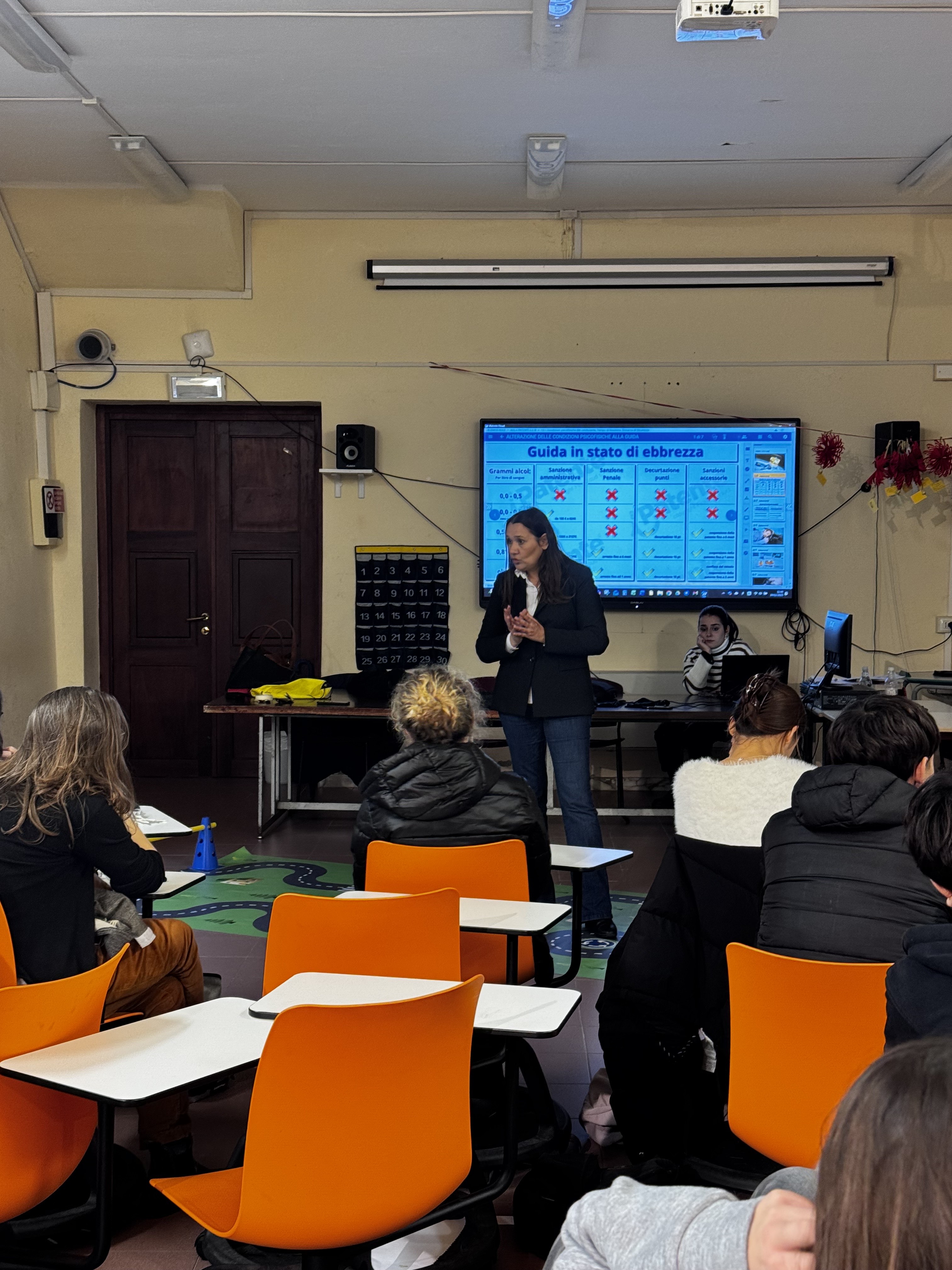 rischi a cui va incontro chi si pone disgraziatamente alla guida di un mezzo senza essere pienamente padrone di sé. Il primo incontro, che ha visto come protagonista la Polizia di Stato nelle persone dell’Ispettore Marco Di Noia e dell’Assistente Capo Coordinatore Giuseppe Guerra, ha posto il suo focus sui reati di guida in stato di ebbrezza e in stato di alterazione per uso di sostanze stupefacenti o psicotrope, sull’accertamento e sulle sanzioni previste dal Codice nei due stati, sulle condotte rischiose alla guida, per poi concludere affrontando i temi dell’omissione di soccorso, dei comportamenti da seguire in caso di incidente, fino a trattare l’omicidio e le lesioni colpose stradali. Nel secondo incontro, animato dalla presenza della Dott.ssa Paola Del Bruno, responsabile dell’Autoscuola Elba, sono state affrontate alcune norme fondamentali del Codice della Strada, integrandole con principi di educazione civica e buon senso. Si è focalizzata l’attenzione su come la guida in stato di ebbrezza da alcol o sotto l’effetto di sostanze stupefacenti possa compromettere lo stato psicofisico, analizzando anche altri fattori che possono incidere sulla capacità di attenzione e sulle relative conseguenze. Durante la lezione, è stata proposta ai ragazzi una prova pratica, che ha suscitato grande interesse e partecipazione: grazie a un tappeto raffigurante un percorso e all’uso di occhiali distorsivi, gli studenti hanno potuto sperimentare in modo diretto la percezione alterata della strada in caso di assunzione di alcol.