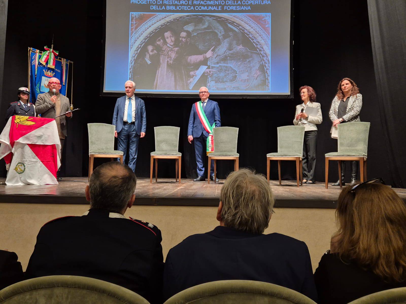 “Un tetto per la conoscenza”. Questo il titolo dell’evento organizzato da Comune di Portoferraio per il progetto di rifacimento del tetto della Biblioteca Foresiana, presentato nella serata di lunedì 29 dicembre al Teatro dei Vigilanti – Renato Cioni dal comune di Portoferraio insieme al presidente della Regione Toscana Eugenio Giani, arrivato appositamente sull’Elba per l’occasione. La biblioteca era chiusa già dal 2023, e l’intervento si è reso necessario per problemi di deterioramento alla copertura della struttura, che si trova all’interno della ex Caserma De Laugier, oggi centro culturale. I problemi poi si sono aggravanti con l’evento alluvionale dello scorso 13 febbraio, e a giugno il presidente Giani ha stanziato per la sua sistemazione un milione e 250 mila euro, in modo da permettere la riapertura dei locali al pubblico.