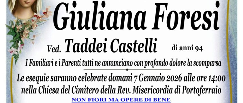 Il sindaco di Portoferraio Tiziano Nocentini e la sua Amministrazione Comunale esprimono tutto il proprio cordoglio per la scomparsa di Giuliana Foresi, avvenuta lunedì 5 gennaio 2026. Simbolo di elbanità e di conservazione delle tradizioni isolane soprattutto nel campo agricolo e vitivinicolo, la signora Giuliana è sempre stata, con la.