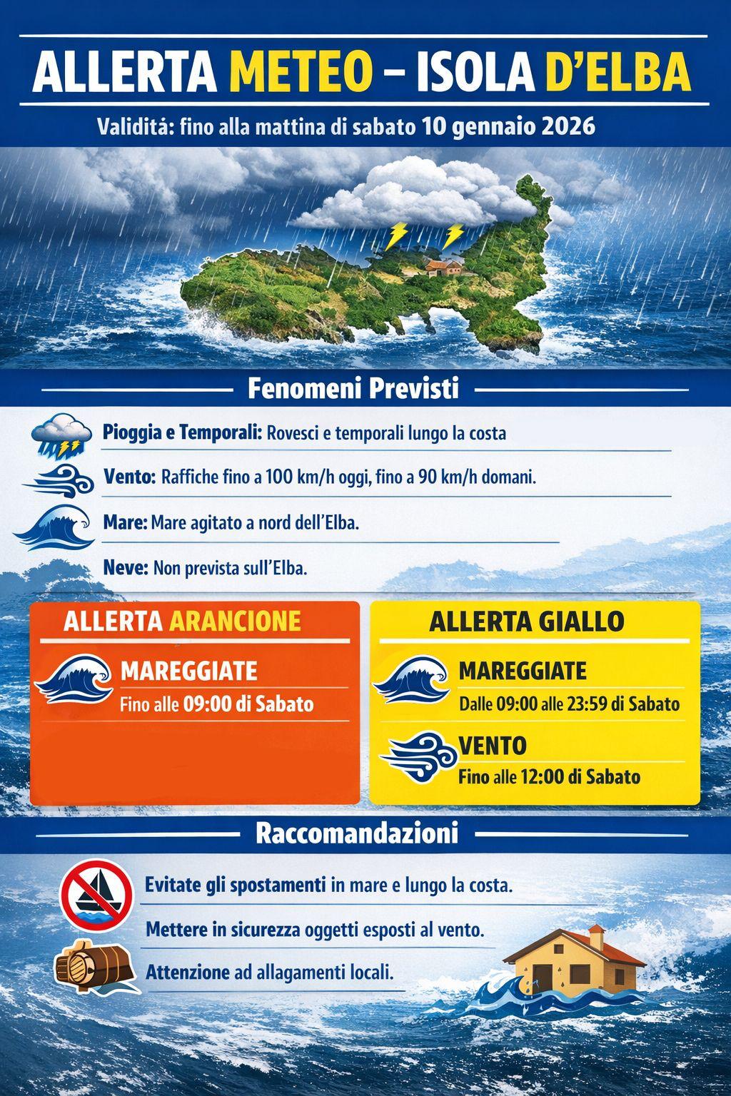 Tra il pomeriggio di oggi e la prima parte della mattinata di sabato sarà possibile lo sviluppo di temporali locali, soprattutto lungo le zone occidentali, con maggiore probabilità su costa e Arcipelago. Il mare si presenterà agitato o molto agitato, soprattutto a nord dell’Elba, con condizioni difficili anche sulle altre coste. È prevista una graduale attenuazione del moto ondoso nel corso del pomeriggio di sabato, ma la mattinata resterà ancora critica per la navigazione. Per questo evento abbiamo il codice arancio ovvero l’allerta su tutta la costa centro settentrionale.