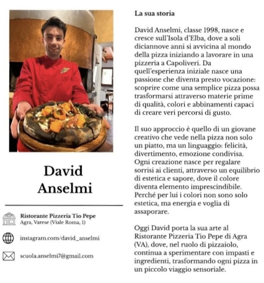 Un impasto di un intenso colore scuro dato dal nero di seppia, che rievoca le profondità del mare dell’Elba, accompagnato da un’elegante e raffinata trota in saor, un pesce di fiume, che riporta ai sapori dei luoghi dove adesso vive e lavora, tagliando importanti traguardi e raggranellando esperienze e soddisfazioni. Sono questi gli ingredienti principali della pizza “Dal mare al lago”, creazione del maestro pizzaiolo d’origine elbana David Anselmi del Ristorante Pizzeria “Tio Pepe” di Agra, in provincia di Varese, inserita nella prestigiosa guida 2025/2026 “Pizze d’Italia” di Culturale Lab, che raccoglie le 100 migliori pizze italiane.