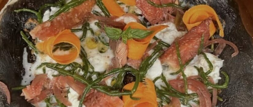 “Dal mare al lago” racchiude tutta la filosofia di David Anselmi: impasto dal gusto salino al nero di seppia, un mare di delicata burrata che fa da letto ai riflessi rosati della trota e all’arancione luminoso delle croccanti carote a nastro. Per finire, il verde della salicornia fresca, che richiama col suo sapore sapido e marino la brezza delle coste che David ben conosce.