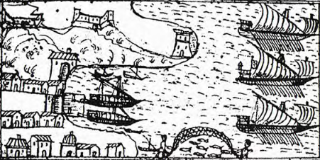 Aurelio Scetti. Disegno di Portoferraio con le galere Grifona e Pisana in ormeggio davanti a porta di Mare mentre la Capitania ,la Vittoria e la Firenze sono in partenza. Biblioteca Nazionale Marciana. Venezia. Riconoscibili sono la Linguella con la torre del Martello, l’arsenale delle Galeazze ,forte Stella e forte Falcone, pescatori che stendono reti in mare.