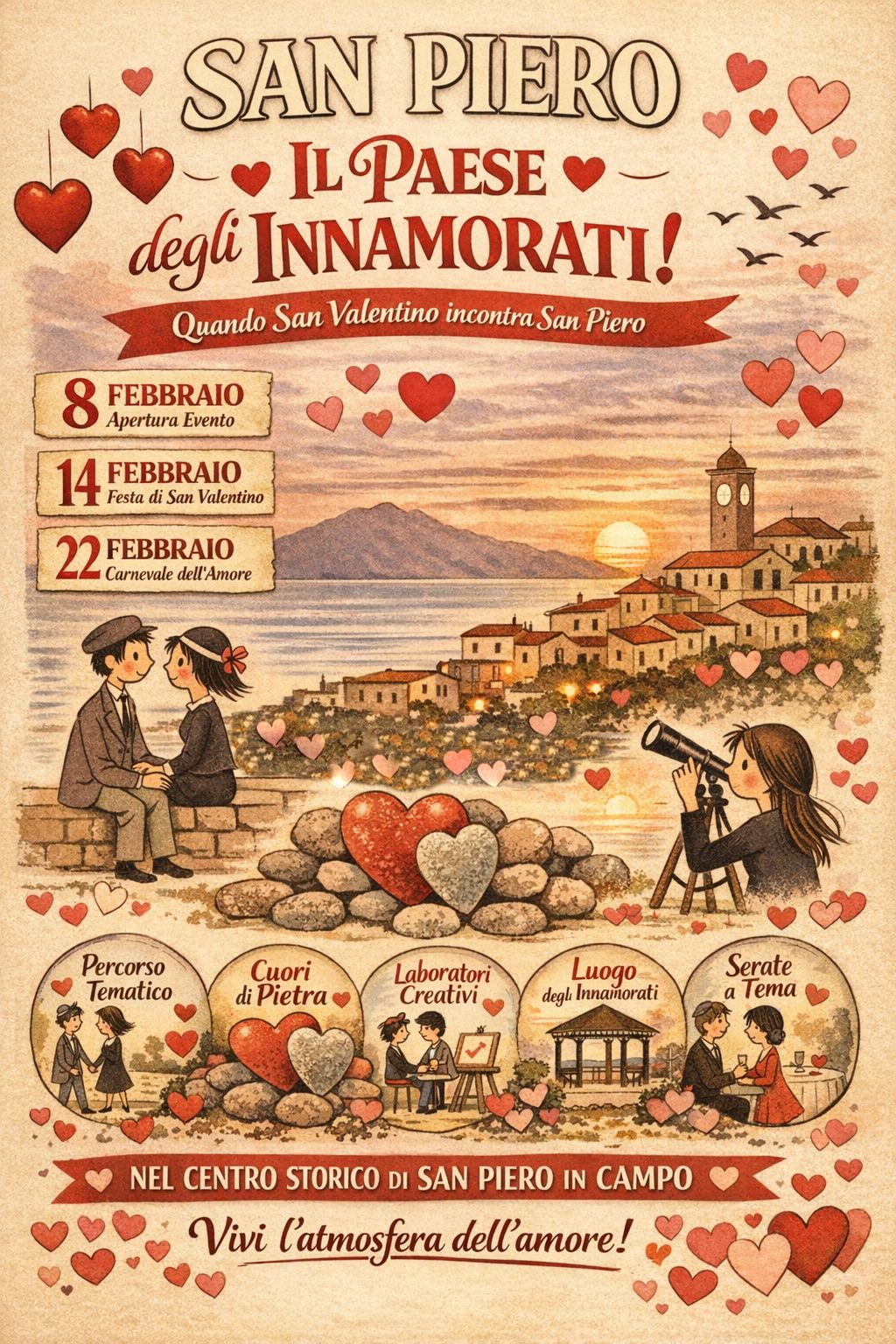 A San Valentino, l’amore incontra il caratteristico borgo campese di San Piero. Nasce da un percorso condiviso tra istituzioni e cittadinanza l’iniziativa “San Piero – Il Paese degli Innamorati”: un progetto culturale, sociale e simbolico che trasforma il borgo di San Piero in Campo in un luogo narrante, capace di raccontare l’amore in tutte le sue forme: affettivo, comunitario, storico, spirituale e territoriale. Il paese di trasformerà dall’8 al 22 febbraio, coinvolgendo alcuni degli spazi più identitari del paese: Piazza La Fonte, Piazza di Chiesa, Facciatoia e la chiesa medievale di San Nicolò, che diventeranno scenari di un racconto diffuso, condiviso e partecipato.