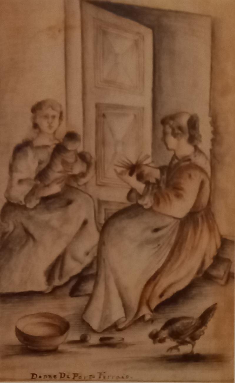 Durante questa sosta all’Elba il Fabroni lascia altri disegni del lazzeretto verso il quale mostra schiere di soldati che salgono per la quarantena. E’attratto anche dalla gente del borgo e ritrae alcune figure femminili della Portoferraio del 1673 : signore in gruppo intente a recitare il rosario,con in collo un neonato, sedute su una seggiola circondate da animali domestici ,intente a fare la maglia