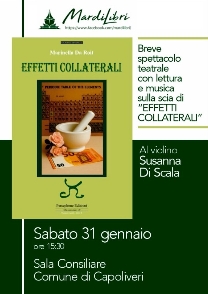 Presentazione con reading teatrale musicale il giorno sabato 31gennaio, presso la sala Consiliare del Comune di Capoliveri, al terzo piano del Palazzo comunale, alle ore 15,30 Del nuovo lavoro editoriale di Marinella Da Roit, “Effetti Collaterali”, Persephone Edizioni, un romanzo ambientato in un’isola di fantasia chiaramente autobiografico per i riferimenti alla professione svolta dall’Autrice nella vita reale che coincidono con quella della protagonista, Anna, e dal taglio del Thriller. Un romanzo avvincente in cui si alternano scorci paesaggistico-naturali ed elementi storico-folcloristici che fanno da sfondo a una vicenda oscura, frutto di pura fantasia. “Anna è una ricercatrice, assistente nella Facoltà di Chimica e Tecnologia Farmaceutica alla Cattolica di Milano dove, giovanissima, si è laureata in Farmacia. Delusa dalla vita, a quarant’anni si vede costretta a lasciare Milano e il lavoro universitario che adora, per fuggire dal dolore di una separazione dal marito, Marco, anche lui ricercatore universitario, che la tradisce con la sua migliore amica. Decide di cambiare vita e di cercare lavoro altrove, rispondendo a un annuncio su una rivista del settore. Si ritrova a lavorare quindi in una piccola farmacia su un’isola. Là riuscirà, col tempo, a lenire le sue ferite, immersa in una natura mozzafiato, ben lontana dal grigiore di Milano. Scoprirà un mondo lavorativo, a lei, in parte, sconosciuto, intorno al quale gravitano personaggi caratteristici e tipici della realtà di un piccolo paese. Inaspettatamente si troverà anche coinvolta, suo malgrado, in vicende poco chiare, con colpi di scena da cui ne uscirà non senza ripercussioni emotive”.