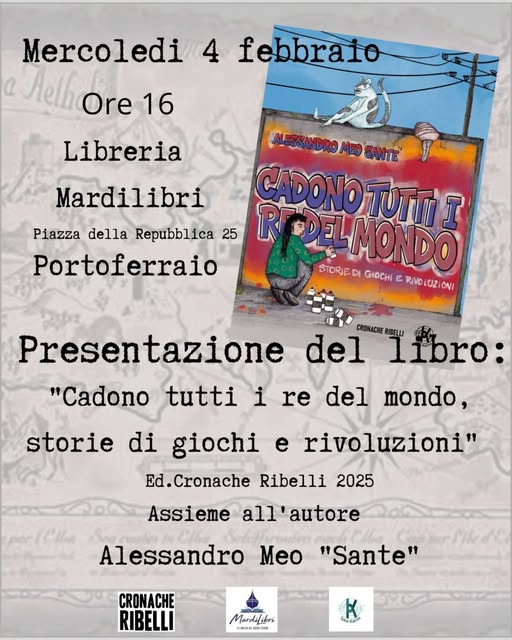 Mercoledì 4 febbraio, alle ore 16, alla libreria MardiLibri lo scrittore Alessandro Meo “Sante” presenta la sua opera “Cadono tutti i re del mondo, storie di giochi e rivoluzioni”, edizioni Cronache Ribelli 2025. “Un’iniziativa proposta da “Elba 4 Gaza” – spiega Silia Boano, titolare della libreria – che sosteniamo “. L’autore verrà alcuni giorni sull’Isola per presentare i suoi libri. A Portoferraio sarà presentata una raccolta di racconti brevi ( alcuni sono storie vere) dedicata ai giochi nel mondo. Sono dirette, poetiche ma anche malinconiche . “ Un puzzle colorato – scrive Alessandro Meo “Sante” – che vorrei tanto spingesse a immaginare altri mondi possibili e impossibili. A ribaltare il presente per costruire un futuro diverso e necessario . Per questo motivo ad alcune ho lasciato il finale aperto, così da poterlo scrivere collettivamente . In fondo “il futuro non è scritto” come diceva Joe Strummer dai Clash e magari potremmo provare a immaginarlo cambiando prospettiva Giocando appunto”. I proventi della vendita del libro andranno all’associazione Elba 4 Gaza. Nel caso di cattive condizioni meteo la presentazione sarà nei locali di Mardilibri, in Pazza della repubblica a Portoferraio.