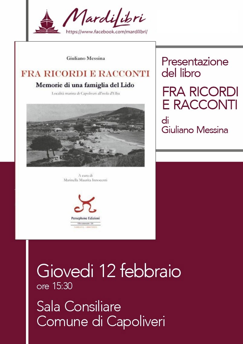 Giovedì prossimo, 12 febbraio 2026, alle ore 15,30, presenteremo nella Sala Consiliare del Comune di Capoliveri il libro dal titolo “Tra ricordi e racconti. Memorie di una famiglia del Lido, località marina di Capoliveri all’isola d’Elba”, di Giuliano Messina curato, dopo la sua morte, dalla moglie, Marinella Maurita Innocenti.