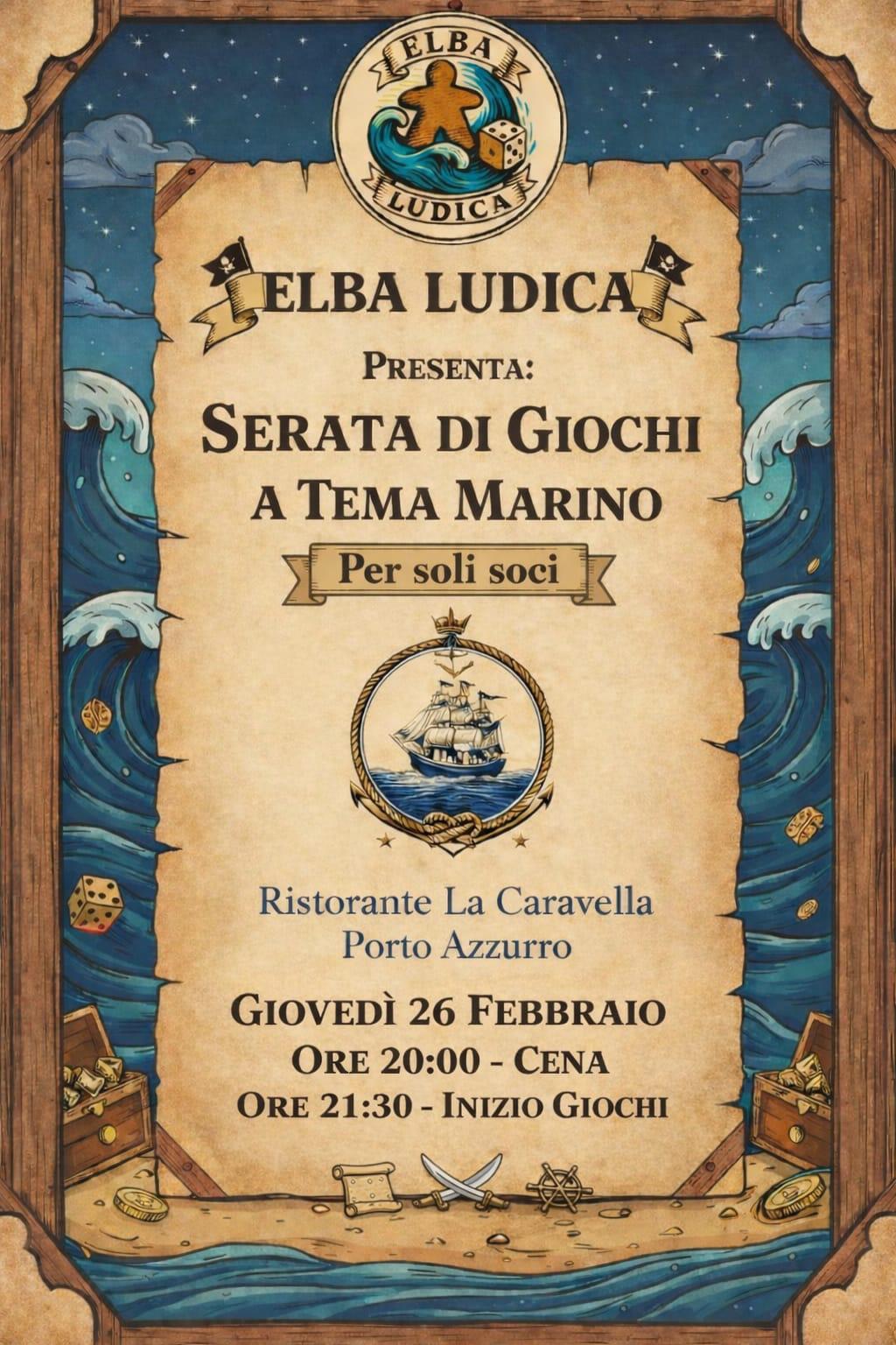 L’associazione “Elba Ludica”, erede dell’ormai celeberrima “Elba in Scatola”, organizza per domani, giovedì 26 febbraio, a partire dalle ore 20, una speciale serata di giochi a tema marino presso lo storico Ristorante “La Caravella” di Porto Azzurro. Un’occasione per ritrovarsi insieme ai soci, mangiare bene e in compagnia, divertirsi e, soprattutto, per far scoprire il mondo “elbano” dei giochi da tavolo anche a chi ancora non fa parte del gruppo ma vorrebbe saperne di più.
