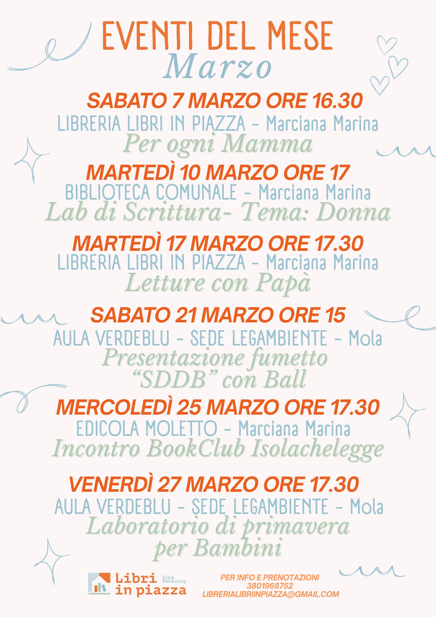 Il programma si apre Sabato 7 Marzo alle ore 16.30 presso la Libreria Libri in Piazza di Marciana Marina con il club Mamme Per ogni Mamma, un incontro speciale dedicato al mondo delle mamme tra condivisione e ascolto per ritagliarsi uno spazio di confronto, sostegno reciproco e ispirazione.