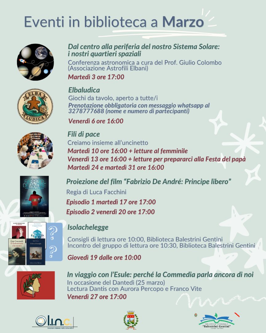 La Biblioteca Comunale “Balestrini-Gentini” di Campo nell’Elba accoglie il mese di marzo con un calendario ricco di appuntamenti: dalla scienza alla letteratura, passando per il cinema e i giochi da tavolo.