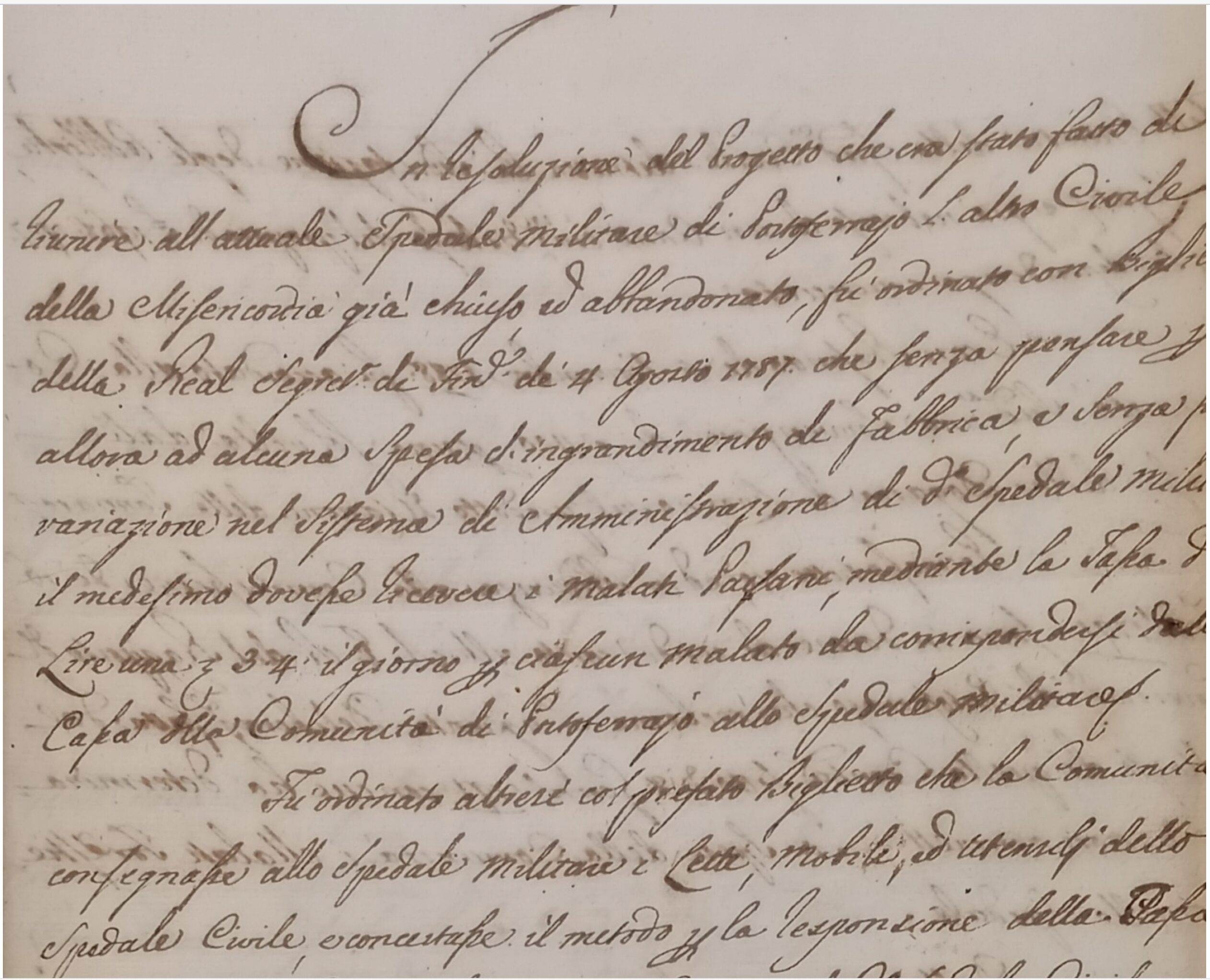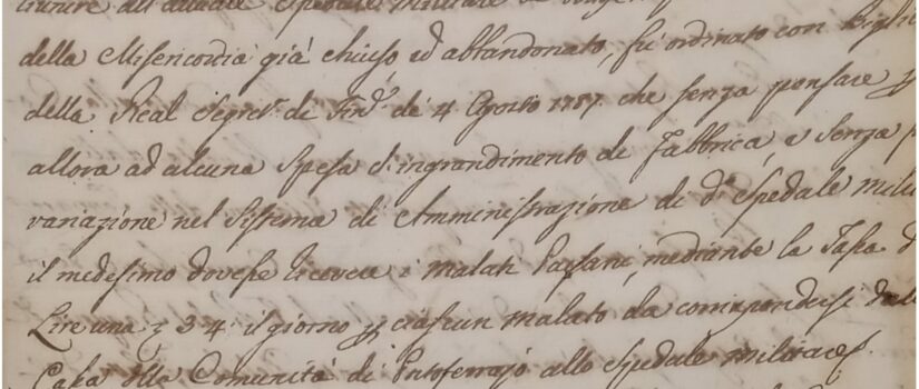 In resoluzione del progetto che era stato fatto di riunire all’attuale ospedale militare di Portoferraio l’altro Civile della Misericordia già chiuso ed abbandonato fu ordinato con Biglietto della Real Segreteria di Firenze di 4 agosto 1787 che senza pensare per allora senza ad alcuna spesa di in gradimento di Fabbrica per variazione del sistema di amministrazione di detto spedale Militare il medesimo dovesse ricevere i malati paesani mediante la tassa di spesa di Lire una .3.4 il giorno per ciascun malato da corrispondersi dalla Cassa della Comunità di Portoferraio all’ospedale Militare.