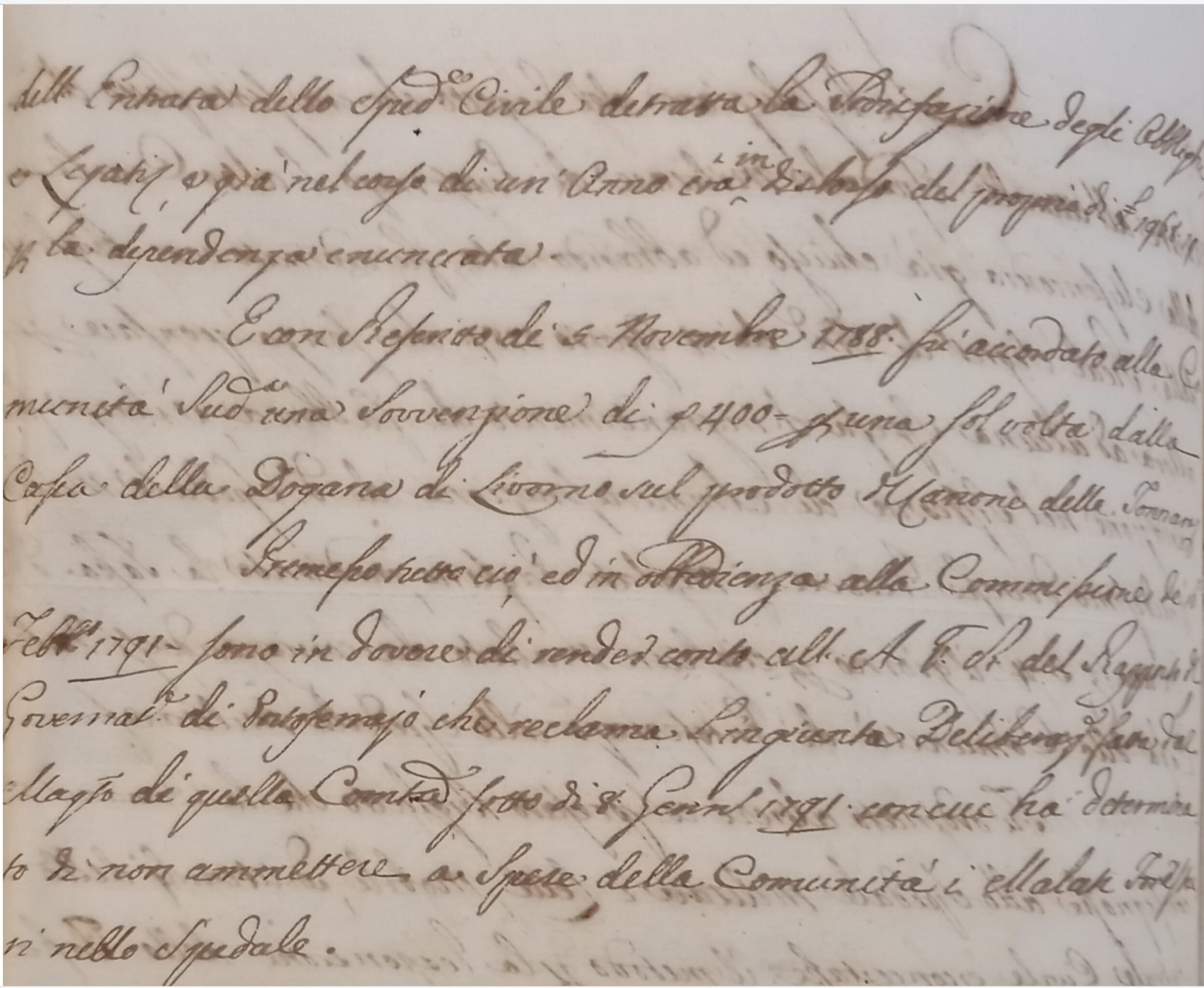 Premesso tutto ciò ed in obbedienza alla Commissione de febbraio 1791 sono in dovere di render conto all’A.V.R. del rappresentante Governante di Portoferraio che reclama l’ingiunta deliberazione fatta dal Magistrato di quella Comunità fatto de 8 gennaio 1791 con cui ha determinato di non ammettere a spese della Comunità di malati forestieri nello Spedale.