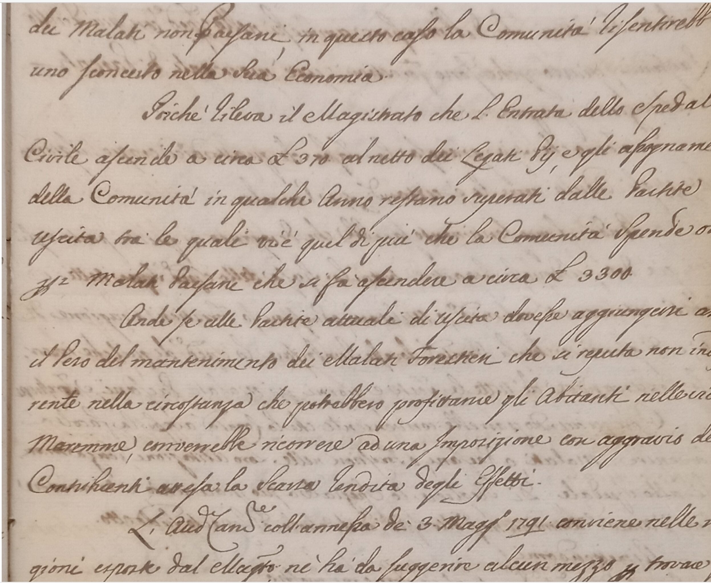 Poiché rileva il Magistrato che l’Entrata dello Spedale Civile ascende a Lire circa 370 al netto dei Legati Pii e gli assegnamenti della Comunità in qualche anno restano superati dalle partite uscita tra le quali vi è quel di più che la comunità spende ora per i malati Paesani che si fa ascendere a circa Lire 3300 .