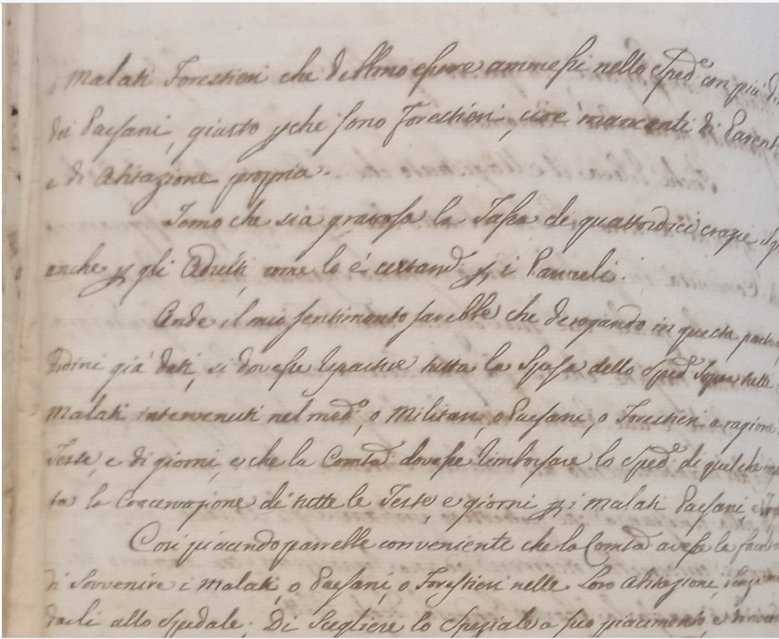Temo che sia gravosa la tassa di quattordici crazie il giorno anche per gli adulti come lo è certamente per i parvoli. Onde il mo sentimento sarebbe che derogando gli ordini già dati, si dovesse ripartire tutta la spesa dello Spedale sopra tutti i malati intervenuti nel medesimo o Militari o Paesani o Forestieri a ragione di teste e di giorni e che la Comunità dovesse rimborsare l’ospedale di qualche imposta per la conservazione di tutte le teste e giorni per i malati paesani e forestieri