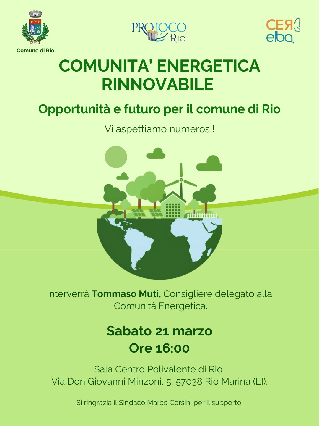 Il Comune di Rio e la Comunità Energetica dell’Isola d’Elba annunciano un appuntamento pubblico dedicato alle energie rinnovabili e alle opportunità di sviluppo sostenibile per il territorio. L’evento si terrà sabato 21 marzo alle ore 16:00 presso il Centro Polivalente di Rio. L’incontro rappresenta un’occasione per condividere i risultati raggiunti finora nel campo delle energie condivise e per discutere delle prospettive future. Durante la giornata interverranno il Presidente della Comunità Energetica dell’Isola d’Elba, l’ingegner Claudio Della Lucia, e il consigliere delegato C.E.R., Tommaso Muti. L’iniziativa si inserisce nel percorso di valorizzazione delle risorse rinnovabili del territorio e di promozione di un modello energetico più sostenibile, coinvolgendo cittadini, Comune e Associazioni in un confronto aperto e costruttivo. Un ringraziamento va al Sindaco Marco Corsini per il suo sostegno e alla ProLoco di Rio per il
