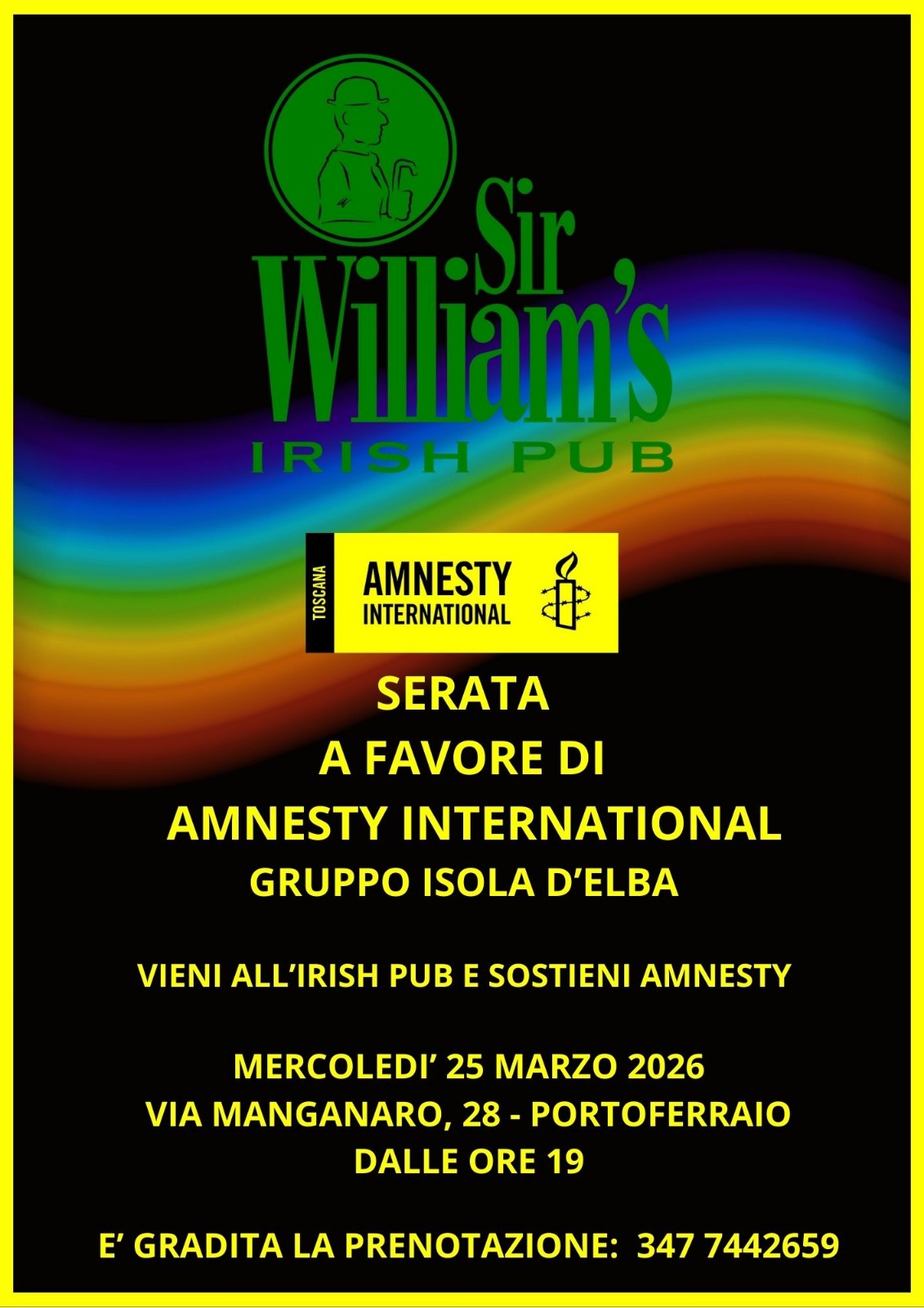 Mercoledì 25 marzo, a partire dalle ore 19:00, il Sir William’s Irish Pub (via Manganaro 28, Portoferraio) dedicherà la serata a sostegno di Amnesty International Gruppo Italia Isola d’Elba, devolvendo in donazione una parte dell’incasso. È gradita la prenotazione al numero 347 7442659.
