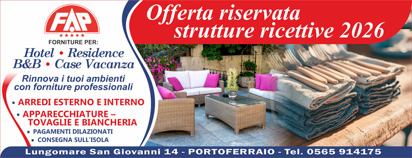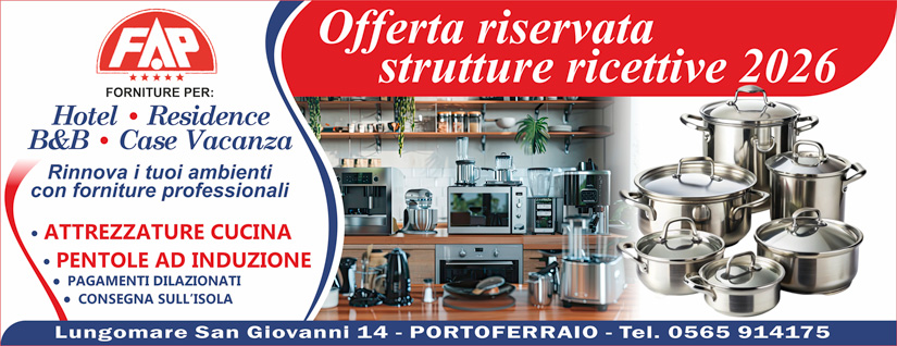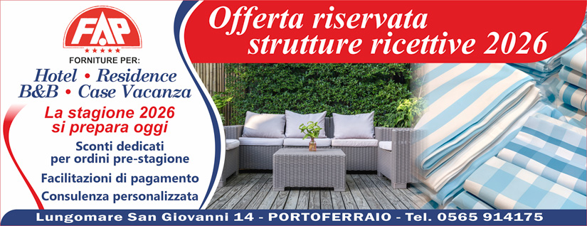La stagione turistica si costruisce nei mesi invernali e primaverili, ed è proprio in questa fase che F.A.P. Forniture Alberghiere di Portoferraio presenta una proposta dedicata alle strutture ricettive dell’Isola d’Elba. L’azienda, punto di riferimento da oltre sessant’anni nel settore delle forniture professionali per hotel e ristorazione, lancia una promozione riservata a hotel, residence, B&B e case vacanza che intendono rinnovare ambienti e attrezzature in vista della stagione 2026. L’offerta comprende arredi professionali per esterni e interni, sedute e tavoli contract, attrezzature per cucine professionali. Previsti sconti dedicati per gli ordini pre-stagione e formule di pagamento agevolate, con possibilità di dilazione e soluzioni personalizzate. La F.A.P. garantisce da sempre l’assistenza tecnica continua. “Preparare la stagione significa investire in qualità e funzionalità – spiegano dall’azienda – offrendo ai nostri clienti soluzioni professionali con la sicurezza di un servizio diretto sull’Isola”. La sede di F.A.P. si trova in Lungomare San Giovanni 14 a Portoferraio. Per informazioni e preventivi personalizzati è possibile contattare il numero 0565 914175.