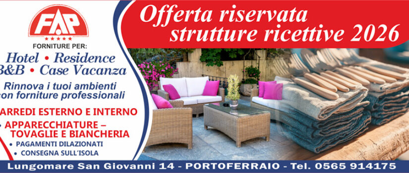 La stagione turistica si costruisce nei mesi invernali e primaverili, ed è proprio in questa fase che F.A.P. Forniture Alberghiere di Portoferraio presenta una proposta dedicata alle strutture ricettive dell’Isola d’Elba. L’azienda, punto di riferimento da oltre sessant’anni nel settore delle forniture professionali per hotel e ristorazione, lancia una promozione riservata a hotel, residence, B&B e case vacanza che intendono rinnovare ambienti e attrezzature in vista della stagione 2026. L’offerta comprende arredi professionali per esterni e interni, sedute e tavoli contract, attrezzature per cucine professionali. Previsti sconti dedicati per gli ordini pre-stagione e formule di pagamento agevolate, con possibilità di dilazione e soluzioni personalizzate. La F.A.P. garantisce da sempre l’assistenza tecnica continua. “Preparare la stagione significa investire in qualità e funzionalità – spiegano dall’azienda – offrendo ai nostri clienti soluzioni professionali con la sicurezza di un servizio diretto sull’Isola”. La sede di F.A.P. si trova in Lungomare San Giovanni 14 a Portoferraio. Per informazioni e preventivi personalizzati è possibile contattare il numero 0565 914175.