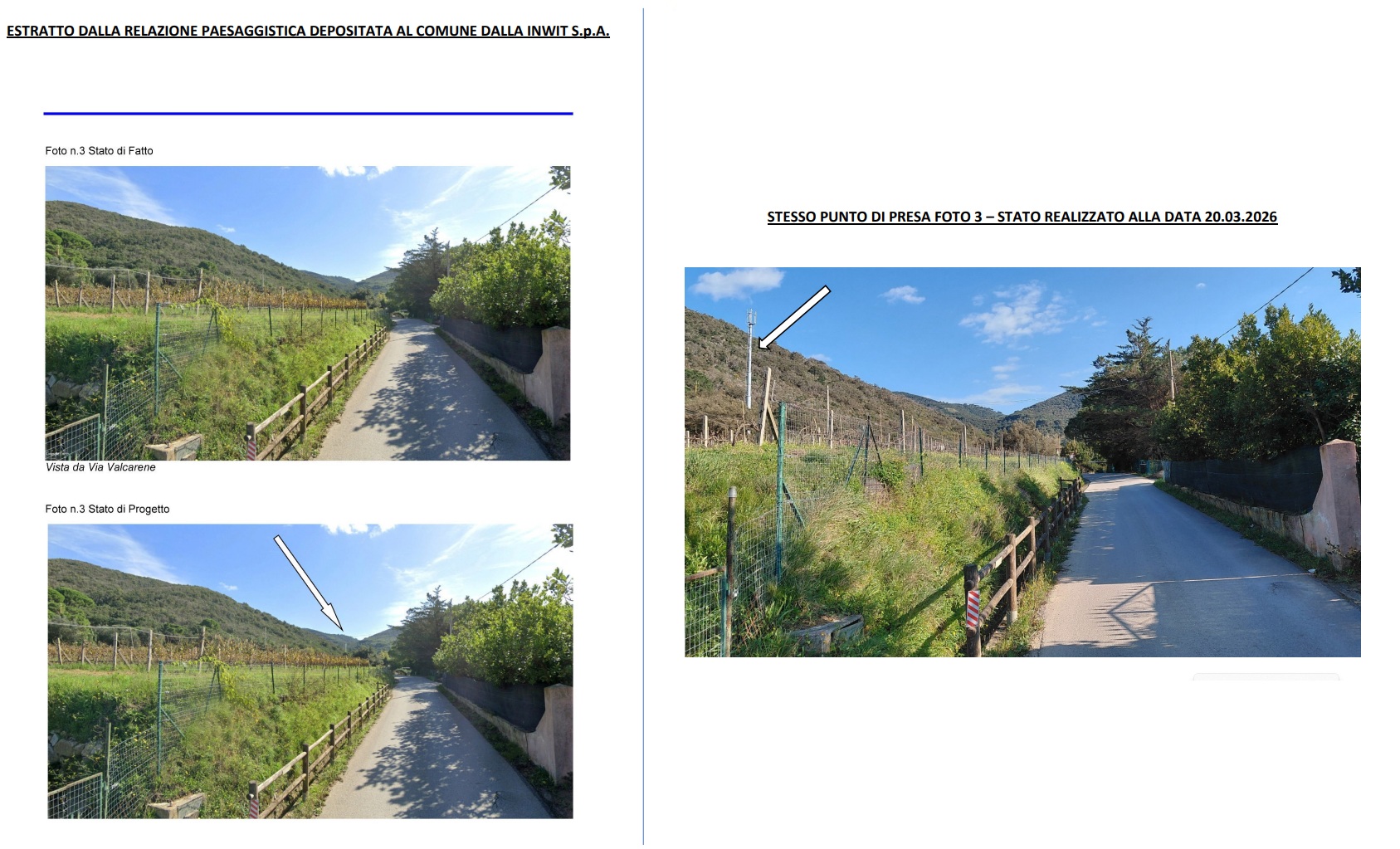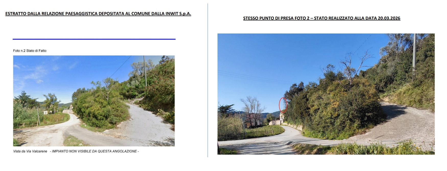 Comitato e Legambiente scrivono che “Pare, infatti, che lo scavo necessario per la posa in opera del basamento di cemento che funge da sostegno alla struttura sia stato collocato in una posizione diversa da quella risultante dagli elaborati progettuali depositati dalla società. In secondo luogo risulta che la planimetria allegata all’istanza della INWIT S.p.A. non sia aggiornata e non riporti la presenza nella zona interessata all’intervento di altre abitazioni costruite in epoca più recente. Ciò potrebbe essere rilevante anche al fine del procedimento amministrativo, in quanto il Comune, a fronte di una più adeguata rappresentazione dello stato attuale di urbanizzazione dell’area avrebbe potuto ritenere di non far decorrere i termini ai fini del silenzio-assenso”.
