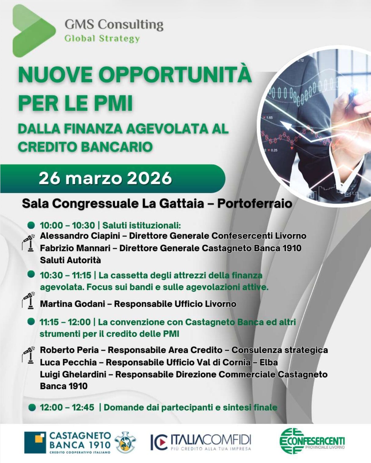 GMS Consulting Global Strategy – società del sistema Confesercenti provinciale di Livorno – invita le imprese del territorio a partecipare ad un incontro pensato per offrire una panoramica chiara e concreta sulle opportunità oggi disponibili per sostenere investimenti, innovazione e sviluppo aziendale. L’appuntamento si terrà giovedì 26 marzo, dalle ore 10:00 alle 12:45, presso la sala Nervi (ex “Gattaia”), in via Vittorio Emanuele II, a Portoferraio.