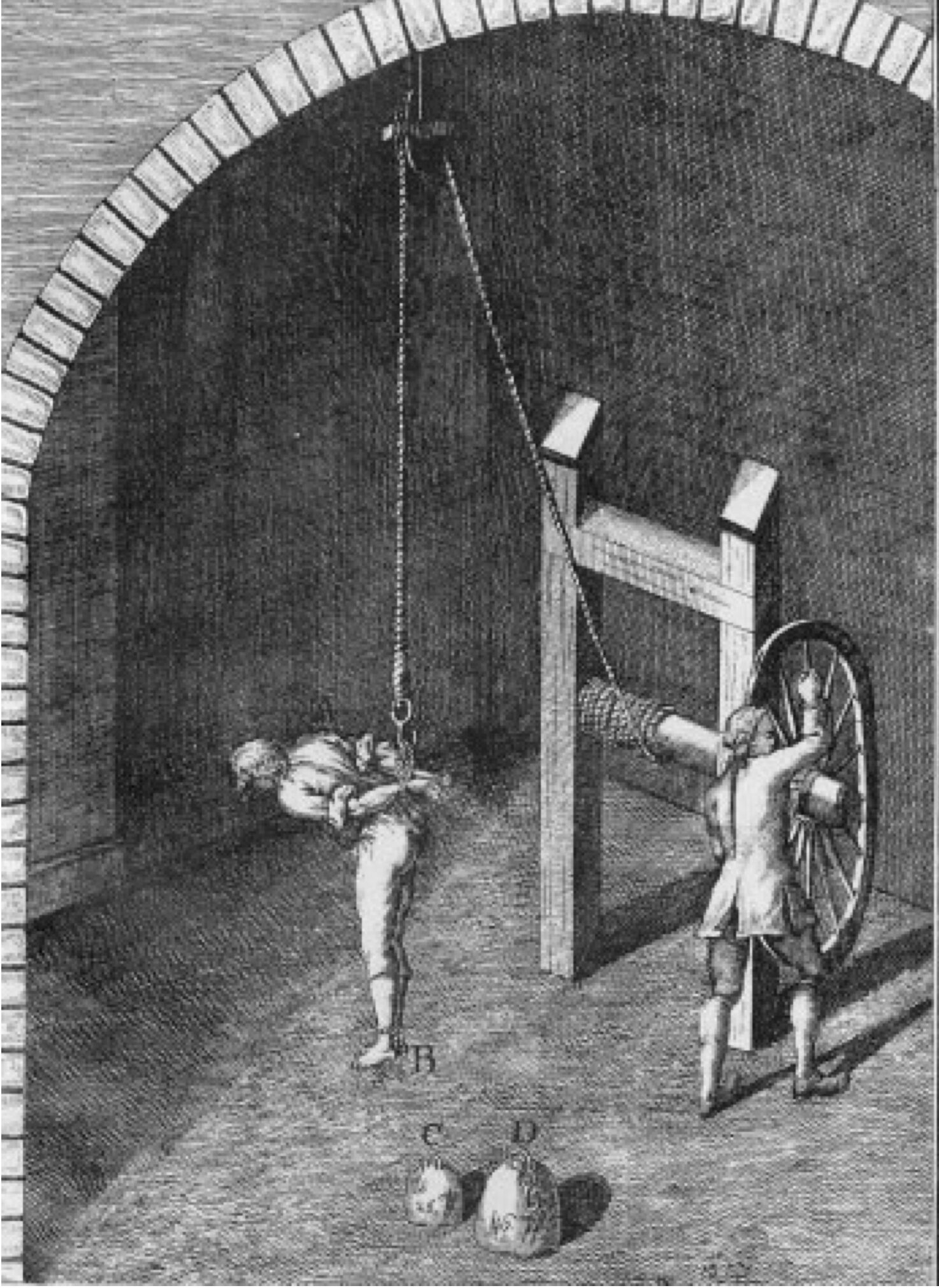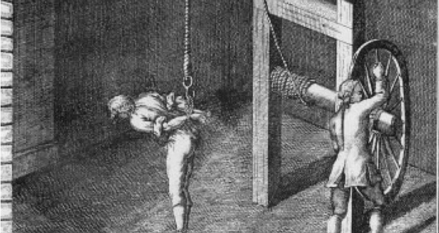 1)Tortura consistente nel legare le mani dietro le spalle ad una corda che scorre su una carrucola appesa al soffitto in modo da sollevare il torturato da terra e nei casi più gravi oscillare o cadere a terra