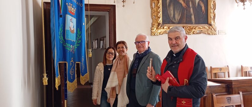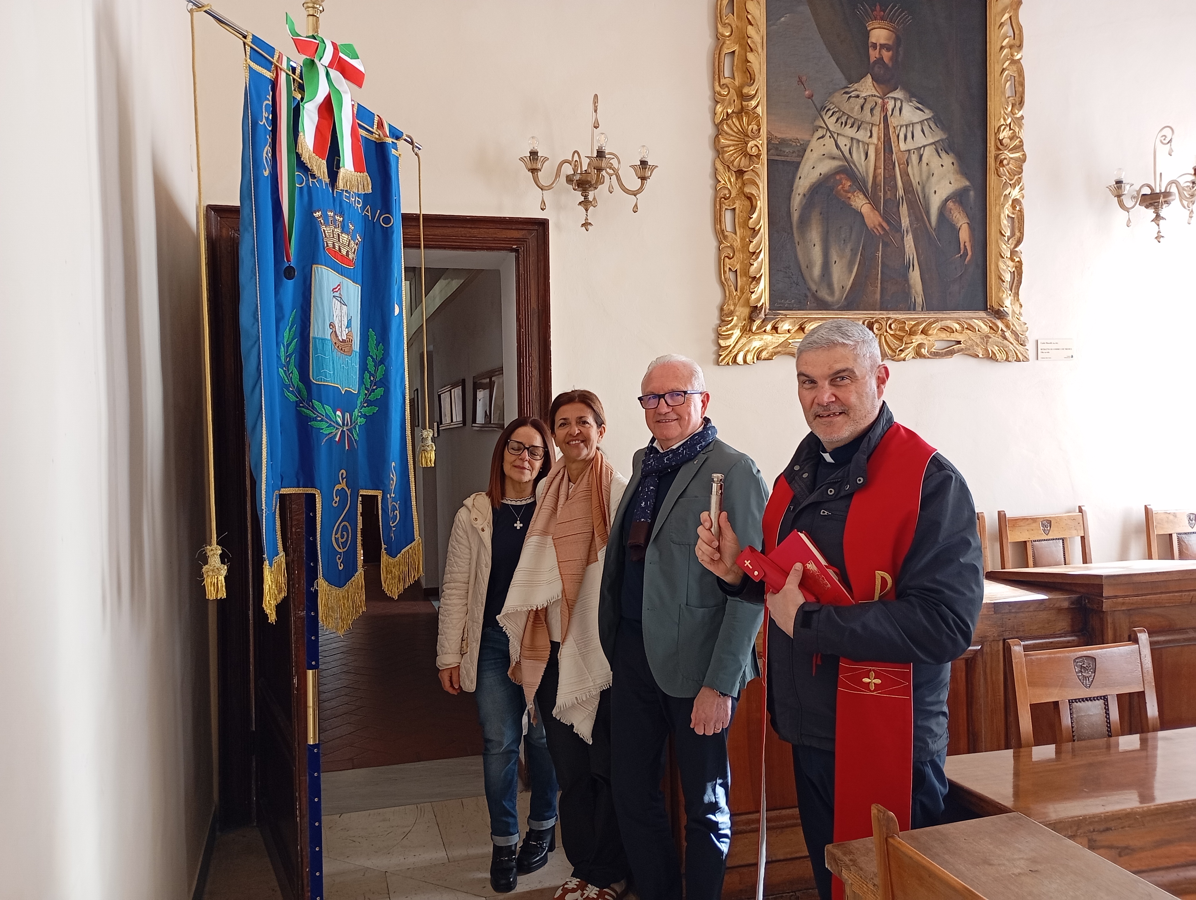 Nella mattinata di venerdì 3 aprile il Parroco del Duomo di Portoferraio don Kevin Sciberras ha fatto visita a Palazzo della Biscotteria, per uno scambio di auguri pasquali con il sindaco Tiziano Nocentini ed una benedizione dei locali che ospitano amministratori e impiegati, con particolare attenzione per il Gonfalone del comune e per la Sala delle Cerimonie, oggi adibita a sala consiliare, dove si svolgono tutti i dibattiti politici della città.
