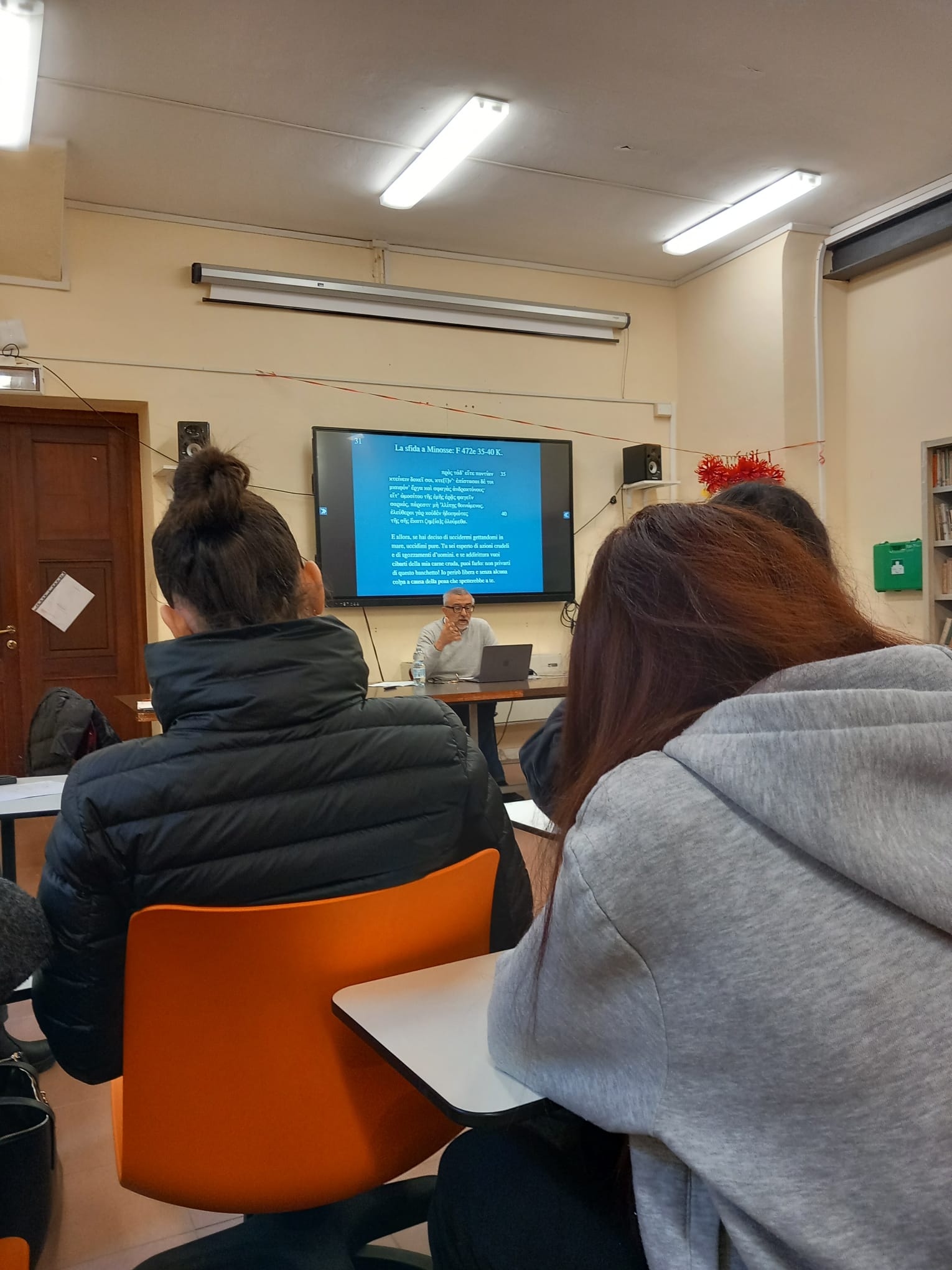 Il Professore, ordinario di Letteratura greca presso l’Università degli Studi di Pisa, studioso della Scuola Normale Superiore di Pisa, autore di molte pubblicazioni, organizzatore di convegni internazionali, coordinatore di consigli scientifici di riviste di settore, ha sapientemente intrattenuto gli studenti su tematiche specifiche inerenti il percorso di studi, ma è anche riuscito ad attualizzare i contenuti proposti.