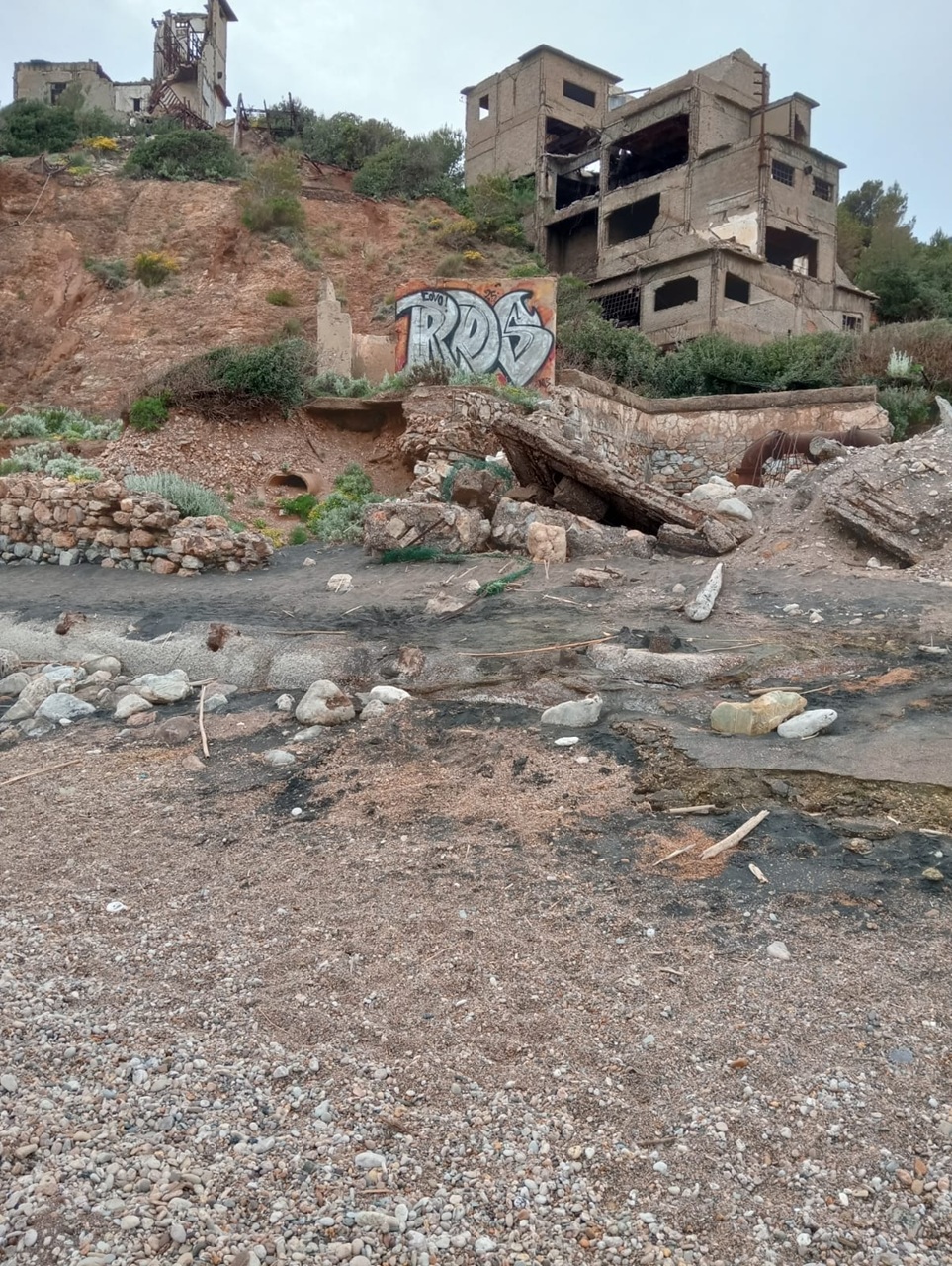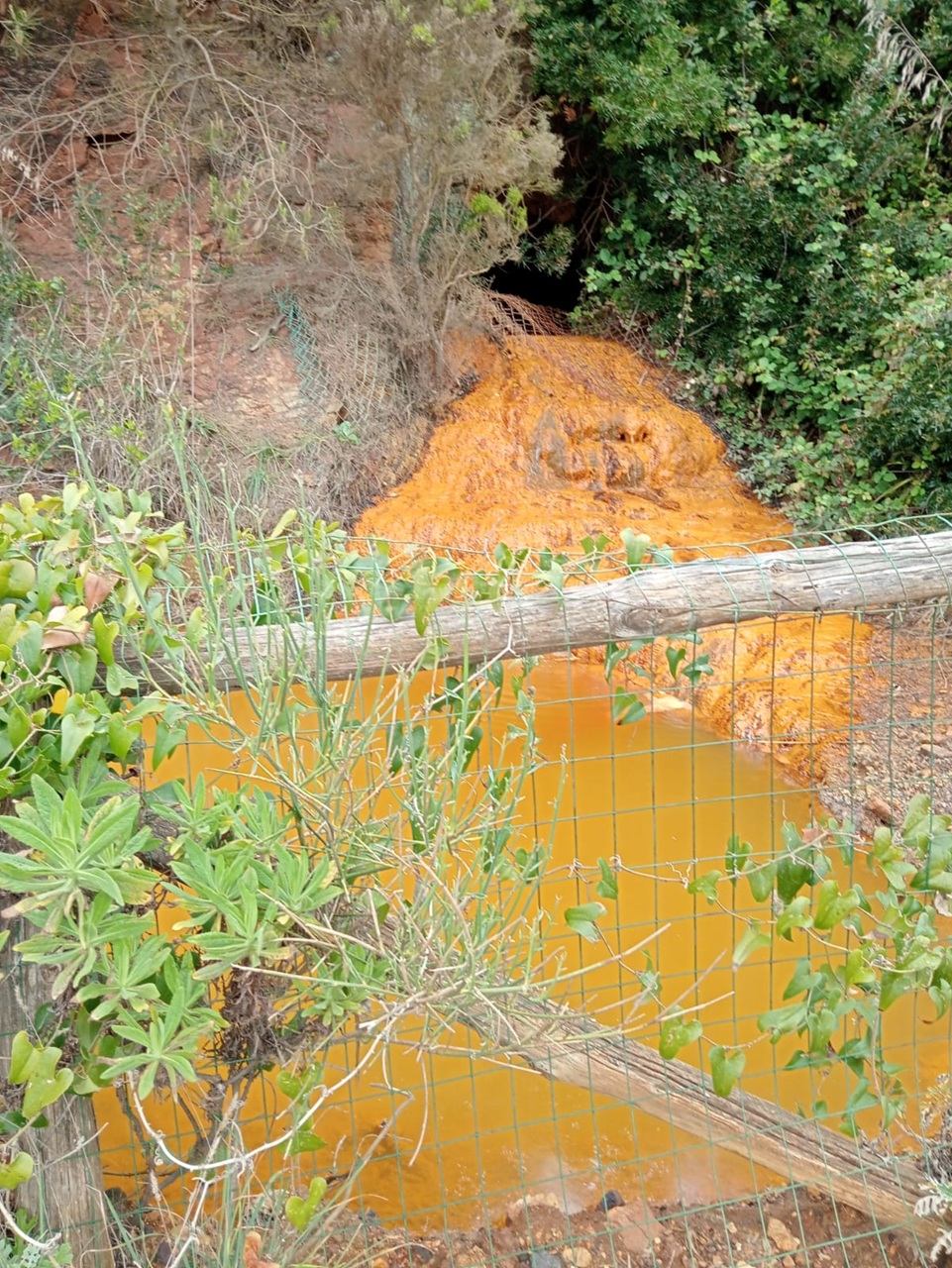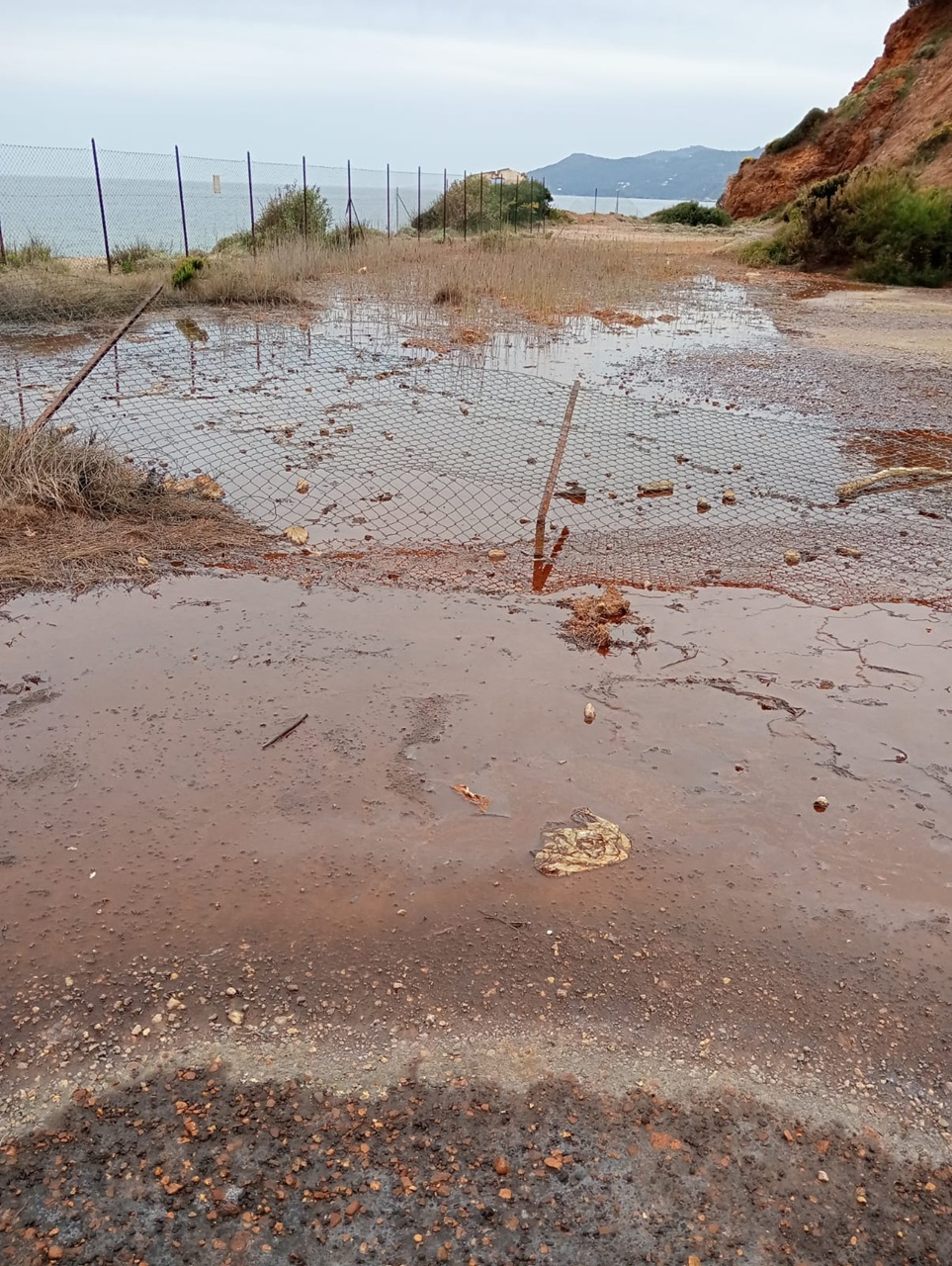 Cala Seregola: Un fiume giallo arriva ormai in spiaggia e a breve al mare non sappiamo che tipo di inquinanti contenga … e comunque una parte del parcheggio adiacente alla spiaggia è diventata uno stagno. Sopra, dove sorgono costruzioni minerarie sempre più in rovina (che altrove sarebbero archeologia industriale) sino franati diversi massi e ci sono pericolosi spunzoni di ferro arrugginito in bella vista e recinzioni e “reti di sicurezza” divelte sia a destra che a sinistra sotto i ruderi.