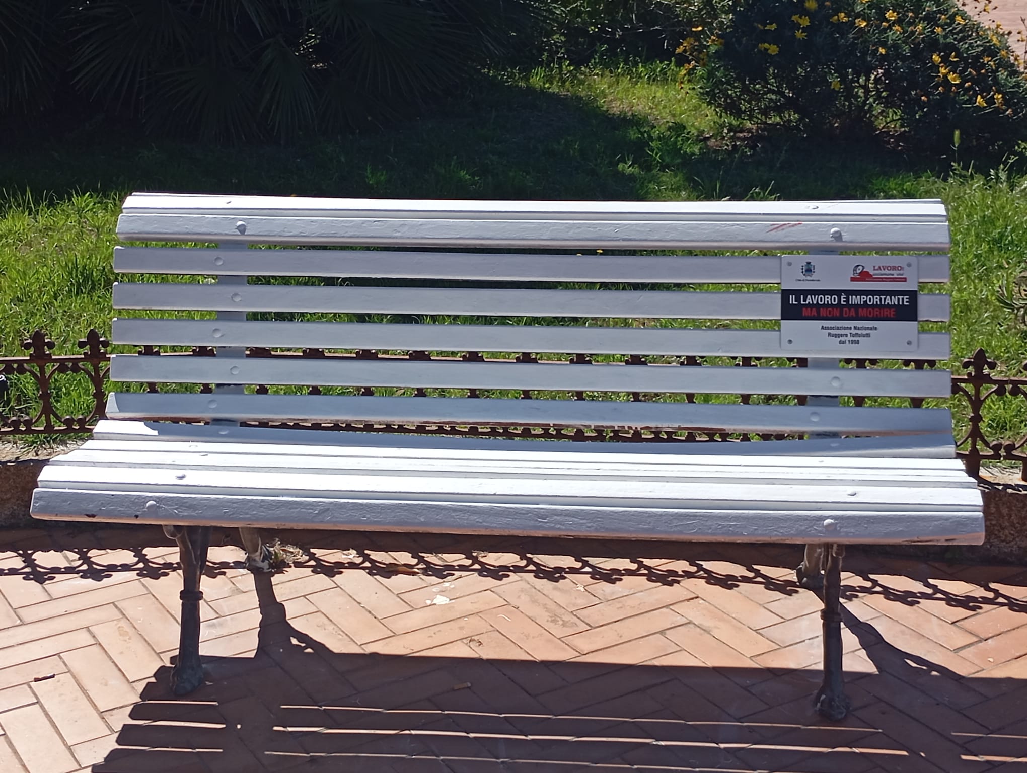 Con una breve cerimonia informale il Comune di Portoferraio e l’Associazione Nazionale per la Sicurezza sul Lavoro “Ruggero Toffolutti” hanno inaugurato, nella mattinata di martedì 28 aprile, una panchina bianca dedicata alla sensibilizzazione sul tema delle morti sul lavoro. Presenti all’iniziativa, oltre al sindaco di Portoferraio Tiziano Nocentini, il presidente dell’associazione “Ruggero Toffolutti” Michele Marinai, il direttore provinciale INAIL Giovanni Lorenzini, la direttrice della sede INAIL di Piombino Beatrice Ciulli, oltre ad assessori e consiglieri comunali di maggioranza e di opposizione.